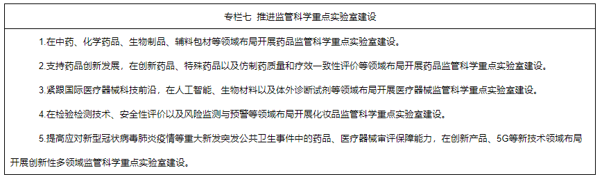 6.深入實(shí)施中國藥品監(jiān)管科學(xué)行動計(jì)劃。統(tǒng)籌推進(jìn)監(jiān)管科學(xué)研究基地和重點(diǎn)實(shí)驗(yàn)室建設(shè),開展監(jiān)管科學(xué)等研究。將藥品監(jiān)管科學(xué)研究納入國家相關(guān)科技計(jì)劃,重點(diǎn)支持中藥、疫苗、基因藥物、細(xì)胞藥物、人工智能醫(yī)療器械、醫(yī)療器械新材料、化妝品新原料等領(lǐng)域的監(jiān)管科學(xué)研究,加快新產(chǎn)品研發(fā)上市。支持國家審評、檢驗(yàn)、評價(jià)、核查等機(jī)構(gòu)參與國家相關(guān)科技項(xiàng)目,鼓勵開展藥品快速檢測新技術(shù)、藥品研發(fā)生產(chǎn)及質(zhì)量控制等研究,開展數(shù)字診療裝備、個體化診療產(chǎn)品、生物醫(yī)用材料的質(zhì)量評價(jià)、檢測技術(shù)及檢測規(guī)范等研究,開展化學(xué)藥品、疫苗、新型藥物和特殊藥物劑型等安全性、有效性評價(jià)技術(shù)以及創(chuàng)新醫(yī)療器械標(biāo)準(zhǔn)體系研究。鼓勵運(yùn)用現(xiàn)代科學(xué)技術(shù),結(jié)合我國傳統(tǒng)優(yōu)勢項(xiàng)目和特色植物資源,加強(qiáng)化妝品新原料研究。